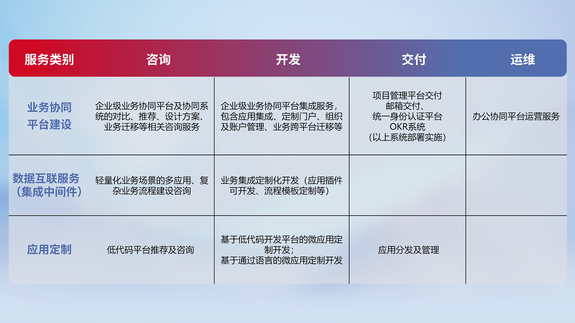 针对钉钉、、、、企微、、、、IDaas等平台级产品提供产品的规划、、方案、、交付、、、、定制化开发等服务,,,实现如统一协同办公、、、智能客户服务、、混合会议管理、、、、智能数据查询、、、等业务场景,,,,实现数字化转型。。。