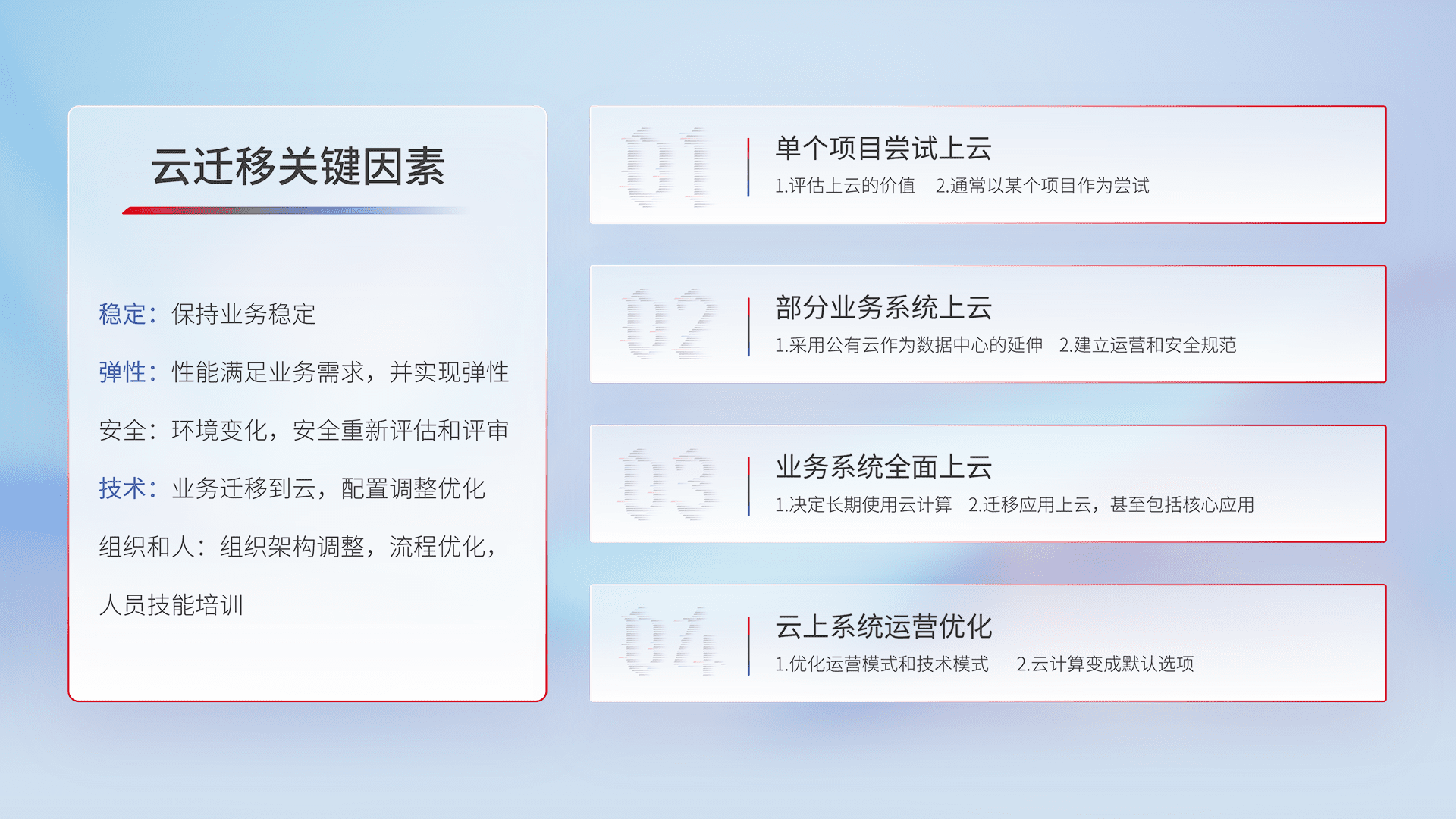 结合实际业务,,,从规划设计、、、、云平台选型、、云原生改造、、数据迁移、、、、集成交付,,,,迁移全过程为客户识别最佳上云路径,,做好风险识别管理,,,,设计网络架构、、、、身份权限、、安全审计合规、、操作审计、、、日志审计、、监控告警策略、、、多站点容灾设计等,,对云上基础设施进行整体规划,,,,提升IT治理水平,,以满足弹性、、、、高可用、、高性能的需求。。。
