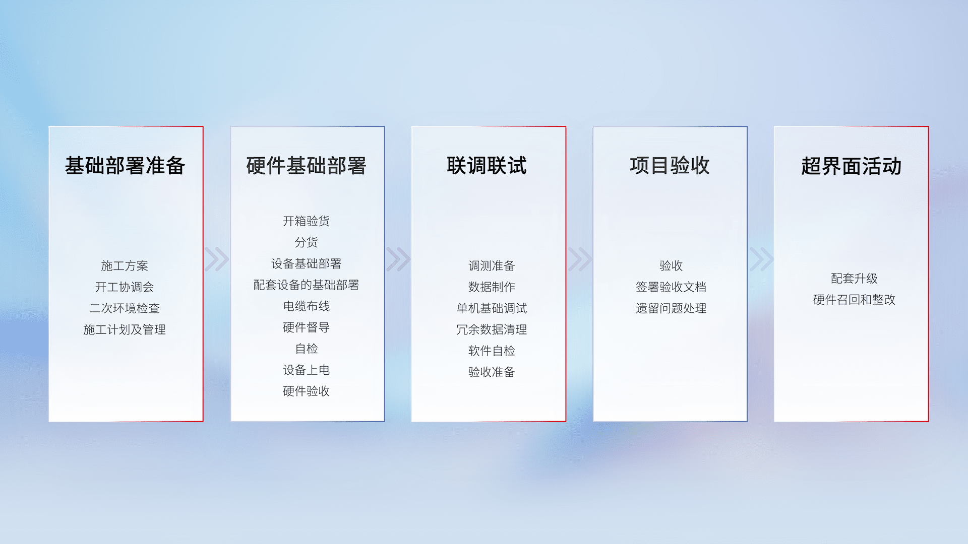 从基础部署准备、、硬件基础部署、、联调联试、、项目验收、、、、越界面活动的全过程可追溯,,,,保证施工质量和进度。。。。